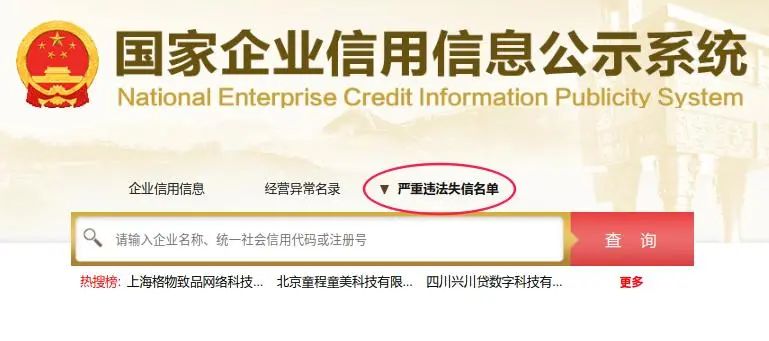 严重违法失信名单:在被列入严重违法失信名单企业中查询。