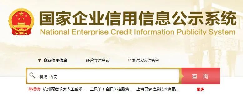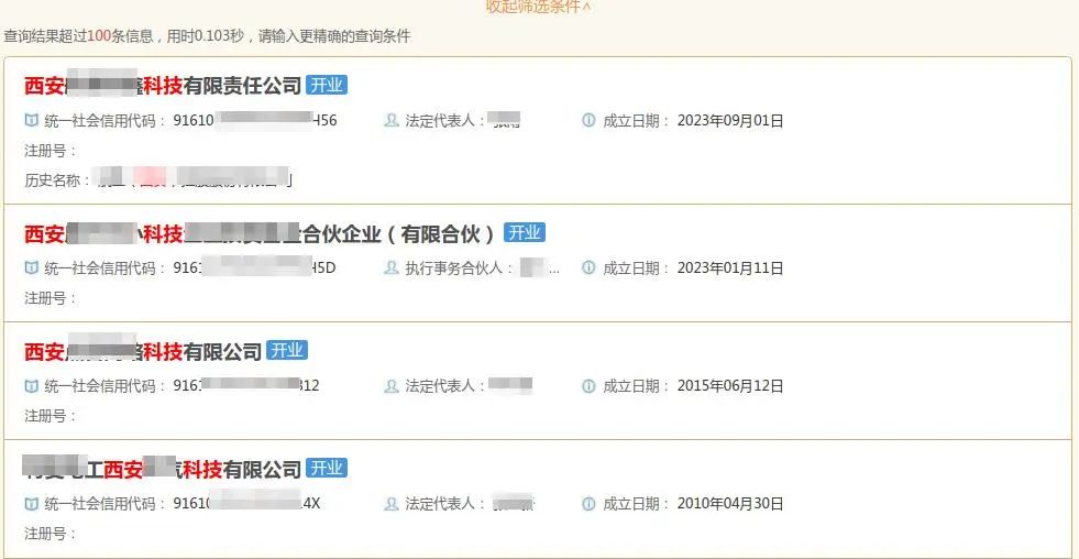 模糊查询:输入关键字+地域,如“科技 西安”,即可检索出名称包含该关键字的企业。