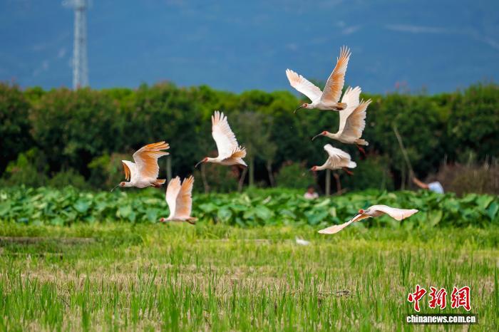 朱鹮成群飞过陕西汉中的稻田。 李吉安 摄