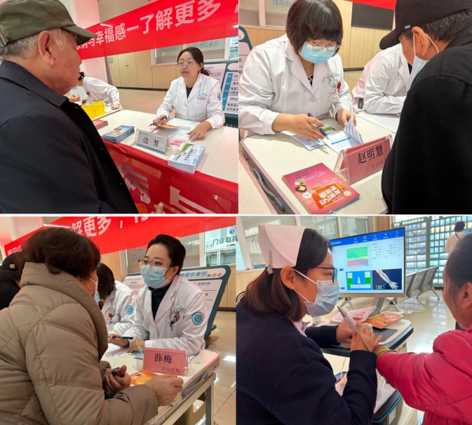 活动当天,义诊现场人来人往,很多患者早早地来现场排队等候,还有人特意携带了厚厚的血糖监测记录本前来咨询。康复医学科内分泌科主任边芳,主治医师赵明慧、薛梅开展一对一问诊专区,针对糖尿病预防、血糖调控、并发症管理等问题为患者答疑解惑,用专业的医疗服务搭建起健康沟通的桥梁,切实将疾病防治知识与关怀送到市民身边。另一边,护士长韩培培,护士王雪雪、孙蓓为市民免费进行血糖、血压检测,骨密度、糖尿病并发症眼底筛查,及时排查健康隐患。