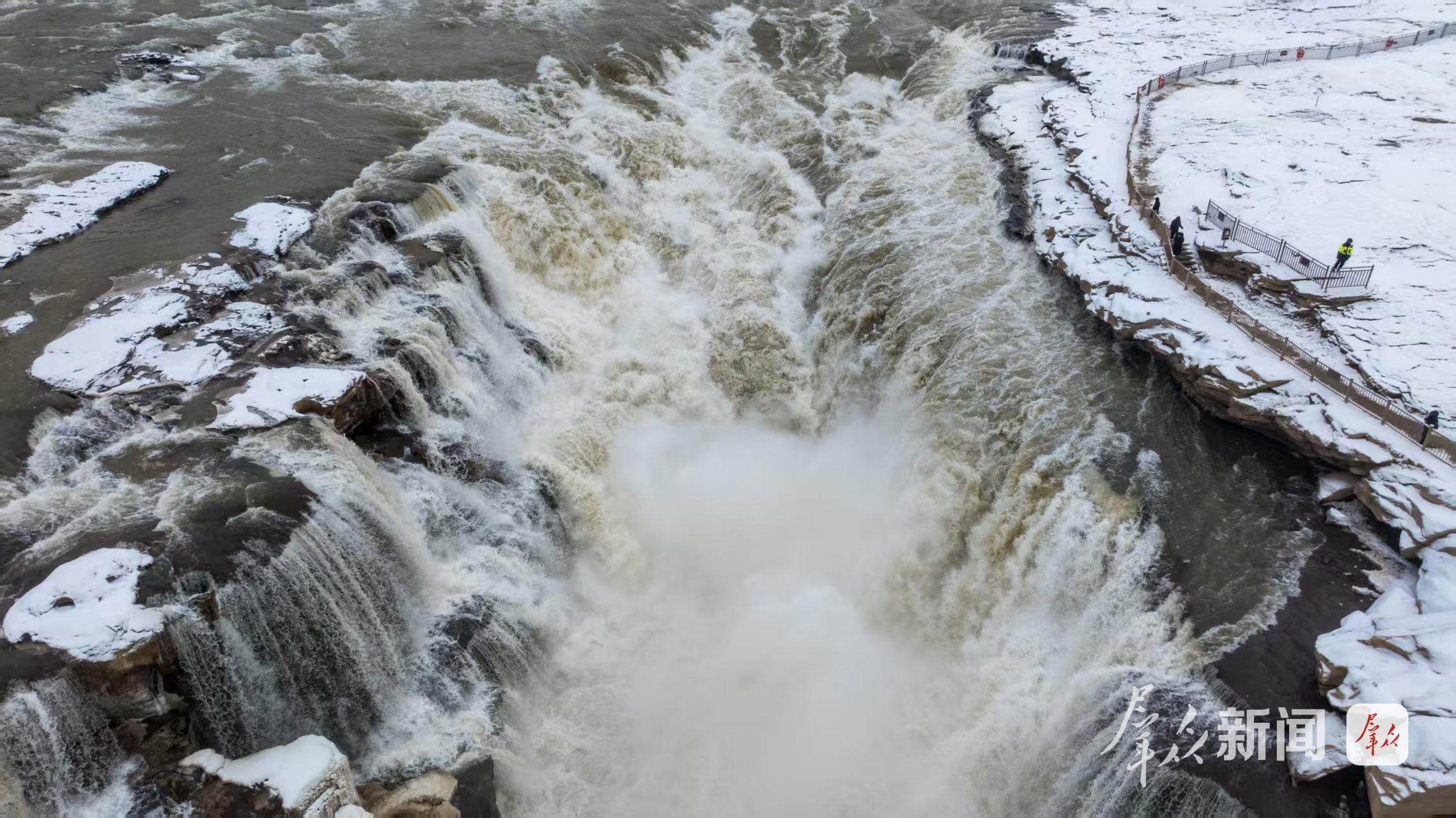 雪幕笼罩下,奔腾的黄河水愈发湍急汹涌,滚滚浪涛呼啸着坠入十里龙槽,激起漫空水雾,在凛冽朔风中翻涌升腾,在瀑布两岸形成了长短不一的冰挂美景,皑皑积雪与晶莹冰挂交相辉映,将冬日壶口的雄浑壮阔勾勒得淋漓尽致,尽显北国风光的豪迈与苍茫。(群众新闻记者 黄佳乐 通讯员 宋洋波 霍勇)