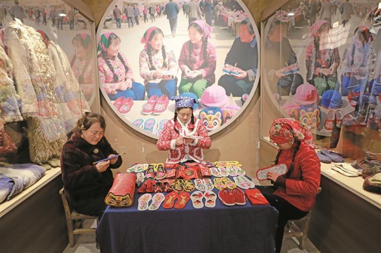 1月5日,吴起县举行“百年乡愁”民俗活态博物馆暨长征书苑开馆仪式。据悉,吴起“百年乡愁”民俗活态博物馆共设农耕馆、生活馆、商贸馆、匠人馆等九大主题展区。多年来,项目团队深入陕北偏远乡村,走访收集各类老物件超30万件,致力于保存与再现深厚的地方民俗记忆。图为1月5日,手工艺人展示刺绣技艺。 通讯员 杭久洁摄
