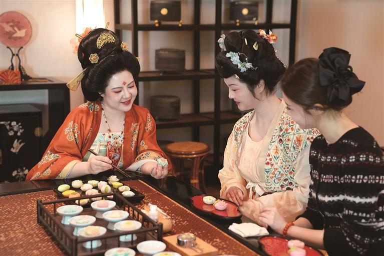 李欢和她的团队近年来不断拓宽品牌的经营方式,致力于搭建场景,让唐果子、唐茶文化走进国内外文化交流活动现场;依托各类艺术和商业场所,推出唐果子制作体验项目,吸引游客和研学团队参与。她们还整合唐茶等唐代生活的相关文化资源,向客户提供国风活动策划与演绎、教学培训、下午茶点、旅游伴手礼等服务和产品,让千年前的风雅韵味,化作更多人可感、可触、可尝的文化信物。