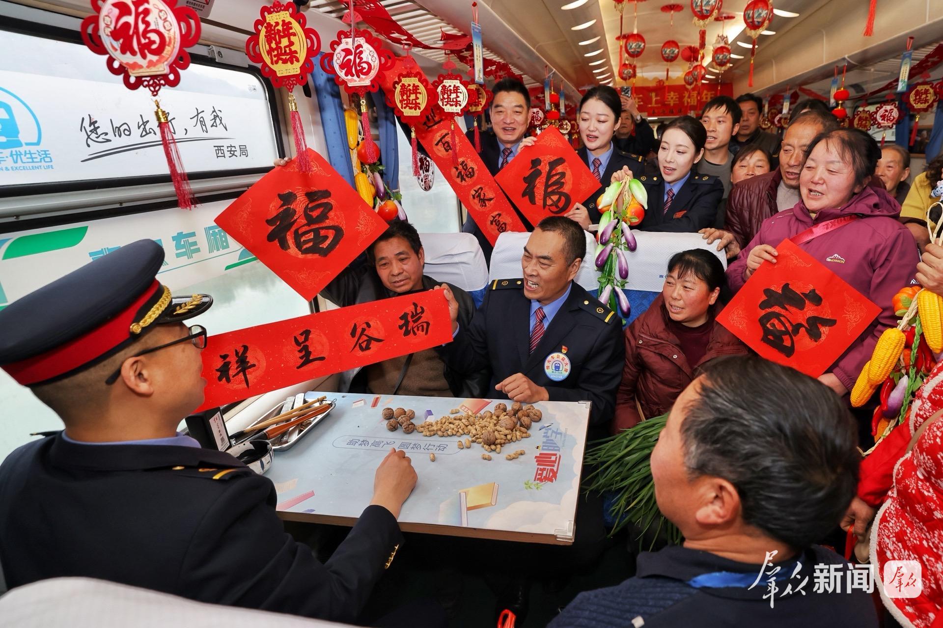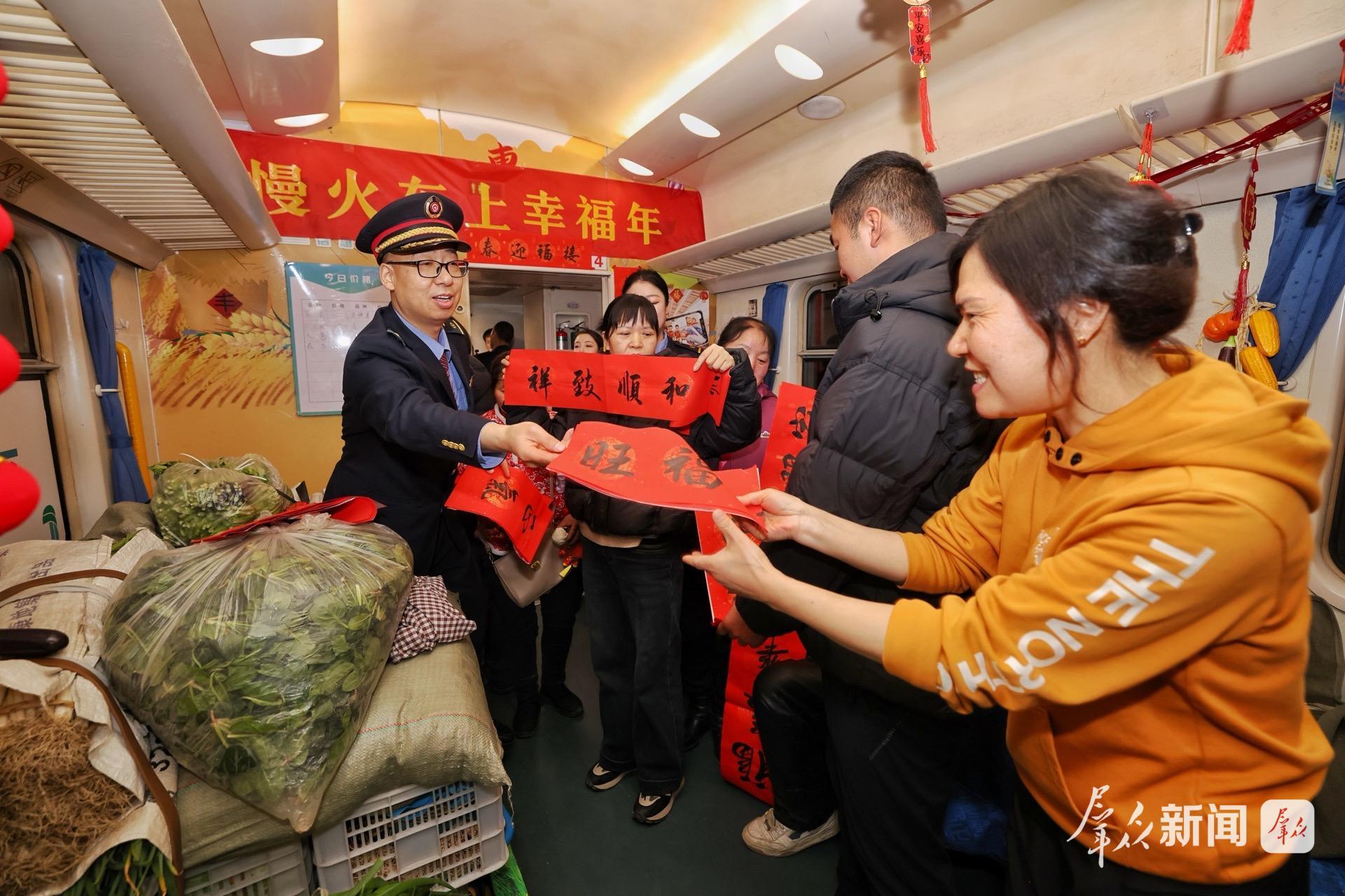 一上车,浓浓的年味便扑面而来。车厢里,大红的灯笼早已挂起,精巧的窗花贴满玻璃,中国结在座位间轻轻摇曳。4号“惠农车厢”的农产品信息栏上方,“慢火车上幸福年”的横幅格外醒目,这已是这项活动连续举办的第9个年头。