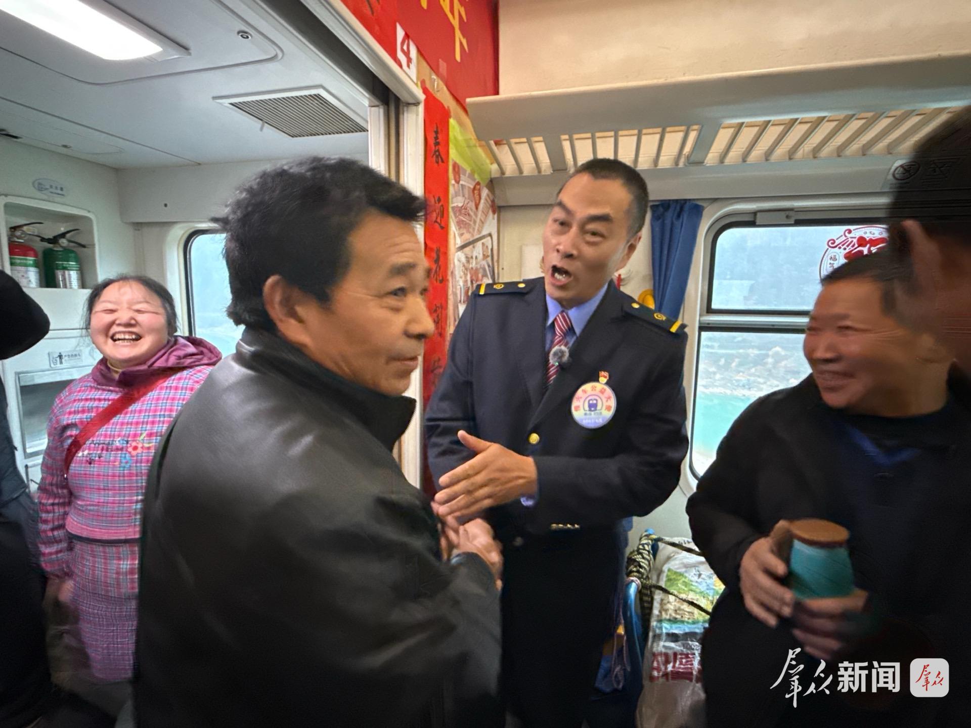 掌声刚落,两位年轻的列车工作人员便手持红彤彤的手绢,欢快地跳起一曲《恭喜发财》,手绢上下翻飞,映着老乡们的笑脸,瞬间将年味“搅”得沸腾起来。