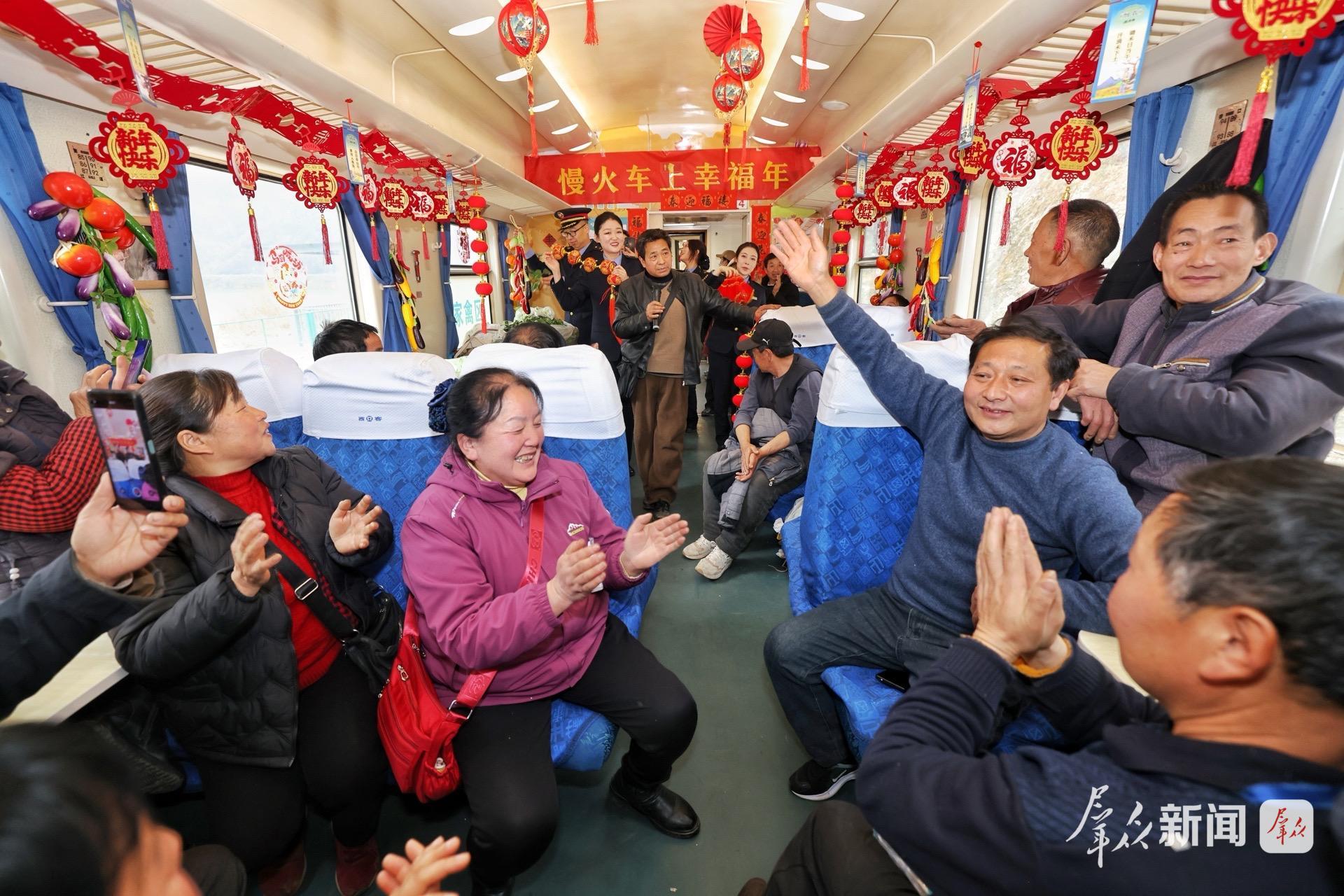 上午10时,“慢火车上幸福年”联欢会活动在欢声笑语中正式开场。车厢瞬间变成了一个移动的、充满泥土气息与热情真诚的“春晚”舞台。