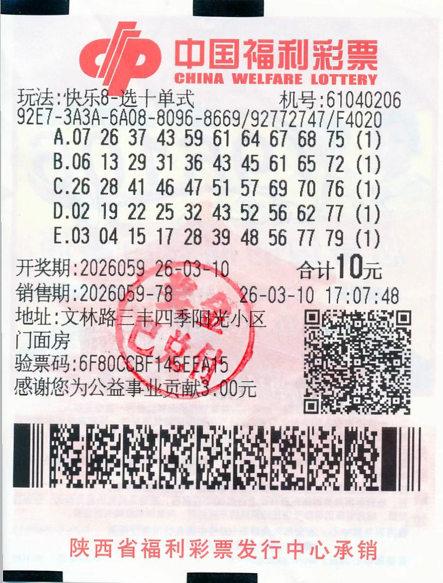 3月10日,福彩快乐8第2026059期开奖,全国唯一的“选十中十”大奖花落咸阳,单注奖金500万元。大奖得主王先生(化名)已于近日领走了这注机选大奖。
